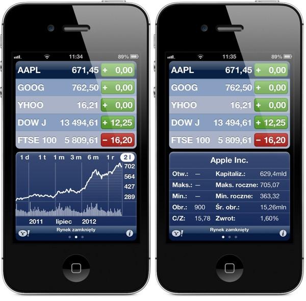 iPhone fabrycznie wyposażony jest w prostą aplikację Giełda, umożliwiającą podgląd kursów akcji, kapitalizację popularnych światowych korporacji na poszczególnych giełdach na świecie, a także ich indeksy.